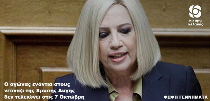 «Ο αγώνας ενάντια στους νεοναζί της Χρυσής Αυγής δεν τελειώνει στις 7 Οκτώβρη. Συνεχίζεται, για μια ανοιχτή κοινωνία και ισχυρή Δημοκρατία», τονίζει η Φώφη Γεννηματά σε άρθρο της στην Εφημερίδα των Συντακτών, λίγες μέρες πριν από την ανακοίνωση της ετυμηγορίας του Δικαστηρίου για τους κατηγορουμένους της Χρυσής Αυγής για τη δολοφονία του Παύλου Φύσσα.