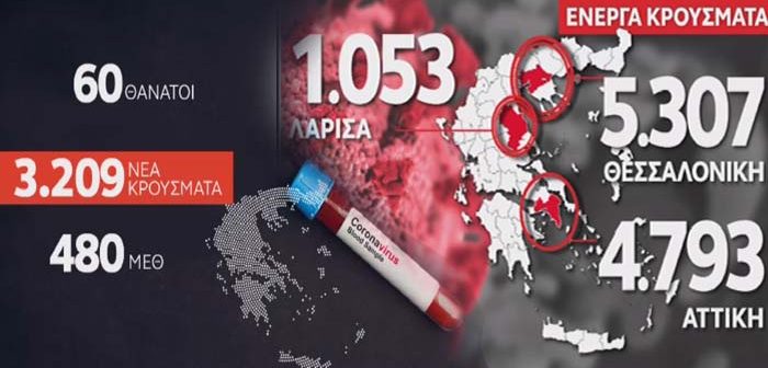 Σε εφιάλτη χωρίς τέλος εξελίσσεται η πανδημία της Covid-19, καθώς ο ΕΟΔΥ σήμερα και καθώς βρισκόμαστε στη δεύτερη εβδομάδα lockdown, ανακοίνωσε 3.209 νέα κρούσματα κορονοϊού στη χώρα μας, την ώρα που οι διασωληνωμένοι έφτασαν τον σοκαριστικό αριθμό-ρεκόρ των 480, 37 περισσότεροι από χθες. Τέλος, έχουμε 60 ακόμα καταγεγραμμένους θανάτους και 1.288 θανάτους συνολικά στη χώρα.