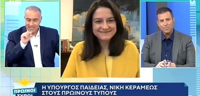 Στον τρόπο που θα ανοίξουν ξανά τα σχολεία όλων των βαθμίδων όταν το επιτρέψουν οι συνθήκες, αναφέρθηκε η υπουργός Παιδείας, Νίκη Κεραμέως, μιλώντας στην εκπομπή «Πρωινοί Τύποι» με τους δημοσιογράφους Νίκο Ρογκάκος και Παναγιώτη Στάθη.