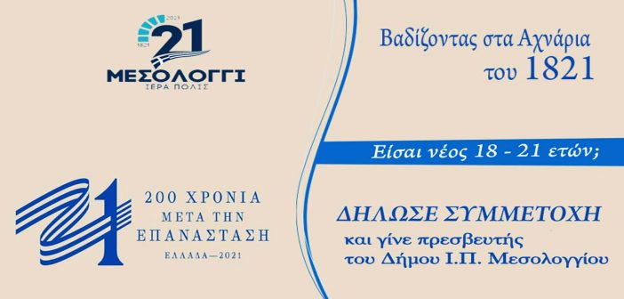 Ο Δήμος Ι.Π. Μεσολογγίου προτείνει στην Επιτροπή «Ελλάδα 2021» τέσσερις νέους ως υποψήφιους για να συμμετάσχουν στη Δράση «Βαδίζοντας στα Αχνάρια του 1821», οι οποίοι θα πρέπει να πληρούν τις παρακάτω προϋποθέσεις: