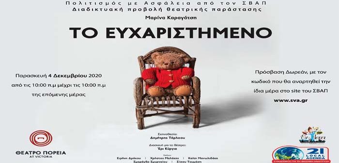 Ο Σύνδεσμος για τη Βιώσιμη Ανάπτυξη των Πόλεων (ΣΒΑΠ) συνεχίζει σε αυτές τις δύσκολες και πρωτόγνωρες για όλους μας συνθήκες της πανδημίας το έργο του. Με γνώμονα την προαγωγή του πολιτισμού με ασφάλεια και σεβασμό στη δημόσια υγεία και ασφάλεια, ο ΣΒΑΠ στο πλαίσιο του Προγράμματος Διαδημοτικής Συνεργασίας «Εν Άστει» και σε συνεργασία με το εγνωσμένης αξίας θέατρο Πορεία θα παρουσιάσουν την Παρασκευή 4 Δεκεμβρίου την επιτυχημένη θεατρική παράσταση «Το ευχαριστημένο». Η παράσταση θα μεταδοθεί διαδικτυακά από τις 10:00 πμ μέχρι τις 10πμ της επόμενης μέρας. Ο σύνδεσμος (link) , καθώς και ο κωδικός πρόσβασης για δωρεάν είσοδο θα αναρτηθούν στην ιστοσελίδα του ΣΒΑΠ την ίδια μέρα. Οι δημότες που επιθυμούν να παρακολουθήσουν την παράσταση μπορούν να επισκεφτούν το site μας, http://www.sva.gr/ , στο οποίο θα βρουν τις απαραίτητες πληροφορίες.