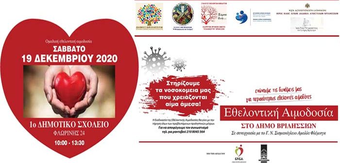 Νέα Εθελοντική Αιμοδοσία στον Δήμο Βριλησσίων προγραμματίστηκε για τις 19 Δεκεμβρίου 2020, μέσω του Οργανισμού Κοινωνικής Προστασίας & Αλληλεγγύης, πάντα σε συνεργασία με τους φορείς αιμοδοσίας της πόλης :