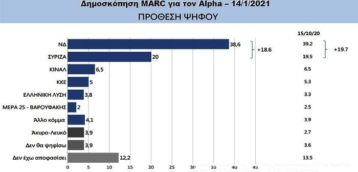 Ιδιαίτερο ενδιαφέρον παρουσιάζουν οι απαντήσεις των πολιτών στην πρώτη δημοσκόπηση για το 2021 με την Νέα Δημοκρατία να συγκεντρώνει στην πρόθεση ψήφου 38,6% έναντι 20% για τον ΣΥΡΙΖΑ. Πρόκειται για μια διαφορά της τάξης του 18,6%, ελαφρώς μειωμένη σε σχέση με την προηγούμενη δημοσκόπηση της MARC τον Οκτώβριο που έδινε τη διαφορά στο 19,7%.
