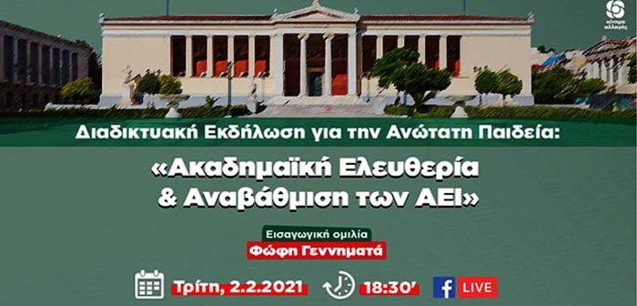 Με αφορμή τις πρόσφατες εξελίξεις στον χώρο της τριτοβάθμιας εκπαίδευσης και τις νομοθετικές πρωτοβουλίες της Κυβέρνησης, το Κίνημα Αλλαγής οργανώνει διαδικτυακή εκδήλωση με θέμα την αναβάθμιση των πανεπιστημίων και την προστασία της ακαδημαϊκής ελευθερίας, την Tρίτη, 2 Φεβρουαρίου 2021 στις 18:30′