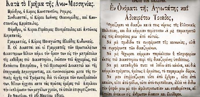 Σαν σήμερα, στις 16 Μαρτίου 1829, δημιουργείται το πρώτο δικαστήριο της Μεσσηνίας, στην πόλη των Φιλιατρών, και διορίζονται οι πρώτοι δικαστές. Πρόεδρος ορίστηκε ο Κωνσταντίνος Ράμφος, συνδικαστές οι: Ιωάννης Οικονομίδης και Κωνσταντίνος Καράπαυλος, πάρεδροι οι: Γεράσιμος Πονηρόπουλος και Αντώνιος Καραπατάς. Γραμματέας ορίστηκε ο Παναγιώτης Ηλιάδης Κυδωνιεύς. Μετά απ΄αυτή την απόφαση οι δικαστές κλήθηκαν στα Φιλιατρά και έδωσαν τον παρακάτω όρκο: