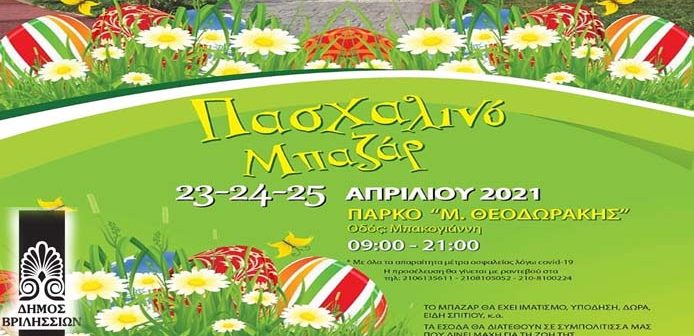 Πασχαλινό Μπαζάρ διοργανώνει η Αντιδημαρχία Κοινωνικής Πολιτικής – Αγωγής Υγείας και ο Οργανισμός Κοινωνικής Πολιτικής και Αλληλεγγύης του Δήμου Βριλησσίων, από τις 23 έως και 25 Απριλίου 2021, στο πάρκο «Μ. Θεοδωράκης».