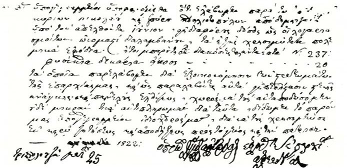 Σαν σήμερα, στις 25 Μάη 1822, ο πρωτοσύγκελος Αμβρόσιος Φραντζής, τοποτηρητής της Επισκοπής Χριστιανουπόλεως εκ μέρους των Εφόρων της Επαρχίας Τριφυλίας παραλαμβάνει για τις ανάγκες των τριφυλιακών εκστρατευτικών σωμάτων μεγάλη ποσότητα πολεμοφοδίων (μπαρούτι, φυσέκια) από τους αδερφούς Σπηλιωτόπουλοι από τη Δημητσάνα που είχαν μπαρουτόμυλους. Στο παραπάνω έγγραφο βλέπουμε την ιδιόχειρη υπογραφή του πρωτοσύγκελου Αμβρόσιου Φραντζή ως εφόρου της Επαρχίας Αρκαδιάς.
