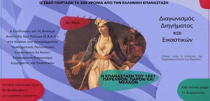 Ο Σύνδεσμος για τη Βιώσιμη Ανάπτυξη των Πόλεων (ΣΒΑΠ) συμμετέχοντας στους εορτασμούς για 200 χρόνια από την ελληνική Επανάσταση διοργανώνει διαγωνισμό Διηγήματος και Εικαστικών με θέμα «Η επανάσταση του 1821 – παρελθόν, παρόν και μέλλον»