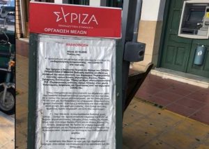 Η παραπάνω φωτογραφία είναι από οργάνωση του ΣΥΡΙΖΑ που στεγάζεται στο κεντρικότερο σημείο της πόλης, έξω από την Εθνική Τράπεζα. Το ενημερωτικό ταμπλό, που έχει στηθεί έξω από τα γραφεία, στο πιο πολυσύχναστο μέρος, ανανεώνεται κάθε τετράμηνο- και αν. Η φωτογραφία αυτή, που τραβήχτηκε στις 20 Φεβρουαρίου του 2021, αναφέρεται σε μια παρέμβαση του Οκτωβρίου του 2020!