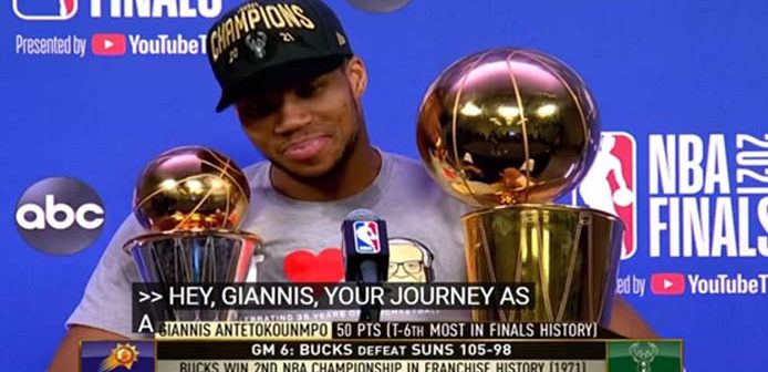 Ο λόγος φυσικά για τον Γιάννη Αντετοκούνμπο, που ακόμη και στη μεγαλύτερη στιγμή της καριέρας του θέλησε να στείλει το μήνυμά του σε όλα τα παιδιά του κόσμου, τονίζοντας πως όλοι πρέπει να πιστεύουν στα όνειρά τους μέχρι τέλους.