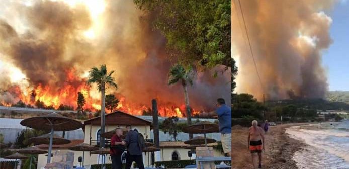 Ήδη επιστρατεύτηκε το φέρι μποτ Δημήτριος Σ. προκειμένου να μεταφέρει πολίτες που κινδυνεύουν από παραλίες τις οποίες πλησιάζει η φωτιά. Αποπνικτική η κατάσταση σε διάφορα σημεία του παραλιακού μετώπου της περιοχής που φλέγεται.
