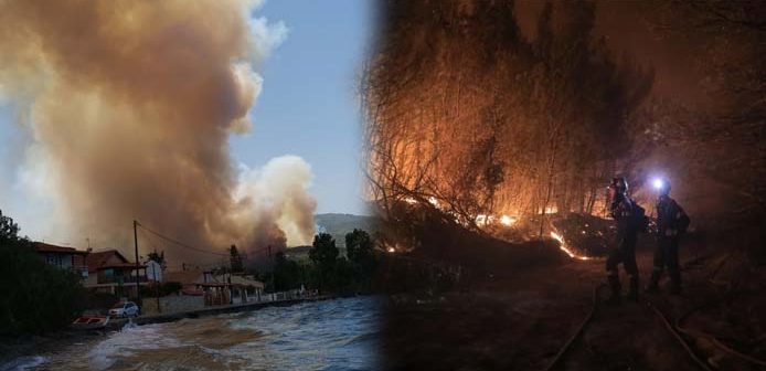 Χθες, πυροσβεστικά πλοιάρια βοηθούσαν στην κατάσβεση καθώς η φωτιά είχε επεκταθεί και κάτω από την παλαιά εθνική οδό, σε περιοχές κατάφυτες, γεμάτες πεύκα μέχρι το νερό.