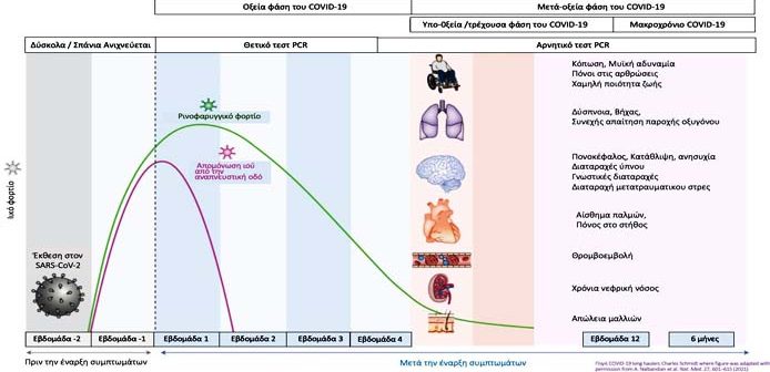 Παραθέτω και μια εικόνα με τα πιο συχνά αναφερόμενα συμπτώματα, και ένα χρονοδιάγραμμα με τα πιθανά συμπτώματα από τότε που κάποιος θα κολλήσει τον ιό, τη σειρά εμφάνισής τους και την πιθανή ή ως τώρα καταγεγραμμένη σε ασθενείς χρονική διάρκειά τους.