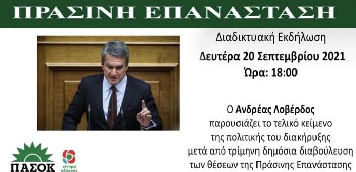 Διαδικτυακή εκδήλωση στην οποία θα παρουσιάσει το τελικό κείμενο της πολιτικής του διακήρυξης, διοργανώνει ο βουλευτής του ΚΙΝΑΛ, και υποψήφιος για την ηγεσία Ανδρέας Λοβέρδος στις 20 Σεπτεμβρίου.
