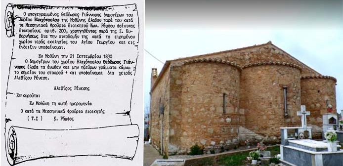 Σαν σήμερα, στις 21 Σεπτεμβρίου 1830, ο η δημογέροντας του χωριού Βλαχόπουλου λαμβάνει από το διοικητή των Μεσσηνιακών Φρουρίων Κωνσταντίνο Ράμφο το χρηματικό ποσό των 200 φοινίκων που είχε στείλει η Κυβέρνηση μετά από αίτημα των κατοίκων προκειμένου να αναγερθεί ο ναός του Αγίου Γεωργίου (πιθανόν να αποκατασταθούν οι ζημιές που είχε υποστεί ο ναός την περίοδο της τουρκοκρατίας και της επανάστασης γιατί από άλλα έγγραφα διαπιστώνουμε ότι ο ναός προϋπήρχε της ημερομηνίας αυτής).