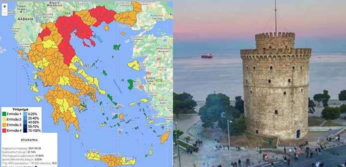 Και επίσημα σε επίπεδο 4 (κόκκινο) επιδημιολογικής επιτήρησης μπαίνει η Θεσσαλονίκη, αλλά και το Κιλκίς, η Λάρισα και η Χαλκιδική, σύμφωνα με τον χάρτη του Covid19.gov.