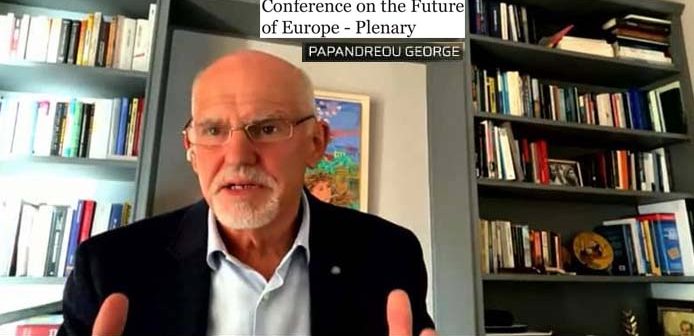 O πρώην πρωθυπουργός, Γιώργος Παπανδρέου, υποψήφιος για την ηγεσία του Κινήματος Αλλαγής, μίλησε χθες αργά το απόγευμα στη δεύτερη ολομέλεια της Διάσκεψης για το Μέλλον της Ευρώπης, της οποίας είναι μέλος.