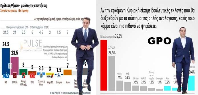 Συγκεκριμένα, στη δημοσκόπηση της Pulse για το ΣΚΑΙ, η κυβέρνηση εμφανίζεται με προβάδισμα 12 ποσοστιαίων μονάδων, ενώ σε εκείνη της GPO δημοσιεύεται στην ιστοσελίδα powergame.gr, η ΝΔ προηγείται με 11 μονάδες.