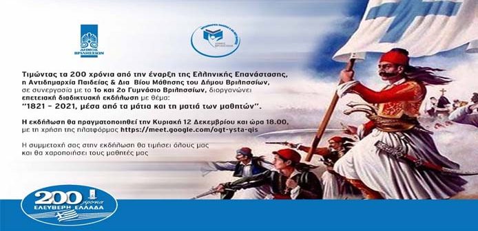 Τιμώντας τα 200 χρόνια απο την έναρξη της Ελληνικής Επανάστασης, η Αντιδημαρχία Παιδείας & Δια Βίου Μάθησης, σε συνεργασία με το 1ο και 2ο Γυμνάσιο Βριλησσίων, διοργανώνει επετειακή εκδήλωση με θέμα: “1821-2021, μέσα από τα μάτια και τη ματιά των μαθητών“.