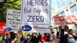 Χιλιάδες νοσηλευτές, αψηφώντας την απαγόρευση των απεργιών του υγειονομικού προσωπικού, συμμετείχαν σε πορεία στο Σίδνεϊ, τη μεγαλύτερη πόλη της Αυστραλίας, σε ένδειξη διαμαρτυρίας για τις ελλείψεις προσωπικού, για την κόπωση και την πίεση που έχουν φορτωθεί κατά τη διάρκεια της πανδημίας του νέου κορονοϊού.