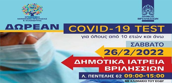 Ο Δήμος Βριλησσίων μέσω του Οργανισμού Κοινωνικής Προστασίας & Αλληλεγγύης , στο πλαίσιο της διαρκούς προσπάθειας για τον περιορισμό της διασποράς του ιού covid-19, διοργανώνει σε συνεργασία με τον Εθνικό Οργανισμό Δημόσιας Υγείας (ΕΟΔΥ) , δωρεάν έλεγχο ταχείας ανίχνευσης αντιγόνου, το Σάββατο 26 Φεβρουαρίου 2022 από τις 09:00-15:00, στα Δημοτικά Ιατρεία του Δήμου Βριλησσίων.