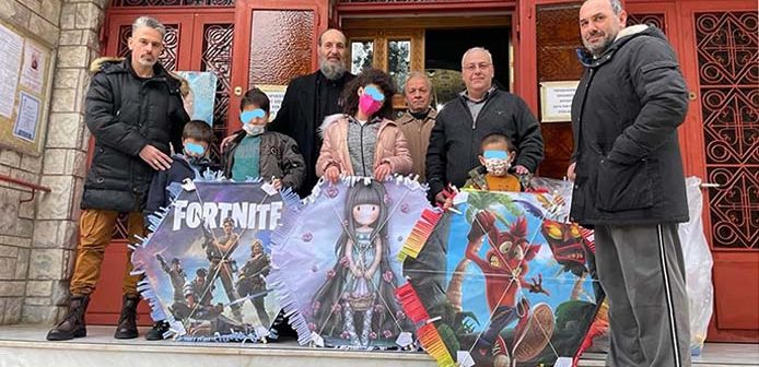 Η Κυριακή γέμισε χαμόγελα και χαρούμενα πρόσωπα καθώς ο Νίκος Μπαρμπούνης μαζί με τη Μαρία Σιδερή και τη Μαίρη Αντωνίου έδωσαν στον πατήρ Μιχαήλ στην εκκλησία του Αγίου Γεωργίου χαρταετούς για να τους χαρίσει στα μικρά παιδιά.