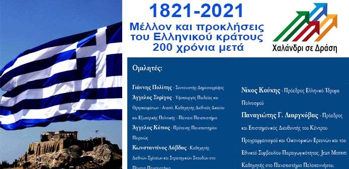 Η Δημοτική Παράταξη “Χαλάνδρι σε Δράση” διοργανώνει εκδήλωση την Κυριακή 20 Μαρτίου στις 11:00 στο Ίδρυμα Ζήση (Κολοκοτρώνη 5) με θέμα «1821-2021: Μέλλον και προκλήσεις του Ελληνικού κράτους 200 χρόνια μετά»