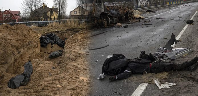 Εκατοντάδες πτώματα αμάχων -πολλοί με δεμένα χέρια– στη μέση του δρόμου, με σημάδια βασανιστηρίων και πολλά εξ αυτών με πυροβολισμούς στο πίσω μέρος του κεφαλιού, ένδειξη εκτέλεσης. Όλα αυτά μόλις μερικά χιλιόμετρα μακριά από μία ευρωπαϊκή πρωτεύουσα, το Κίεβο…