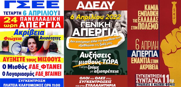Σε ανακοίνωσή της αναφέρει ότι «καλεί όλους τους εργαζόμενους, τους άνεργους, τους συνταξιούχους να μετάσχουν στην 24ωρη Πανελλαδική Απεργία πού έχει προκηρύξει για μεθαύριο Τετάρτη 6 Απριλίου 2022. Με κεντρικό σύνθημα, “μισθός δε φτάνει, ο λογαριασμός δε βγαίνει” η Συνομοσπονδία διεκδικεί μεταξύ άλλων αύξηση των μισθών και μέτρα αντιμετώπισης της ακρίβειας, ώστε να υπάρξει αξιοπρεπής διαβίωση για όλους».