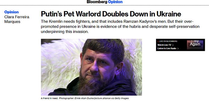 - Διαβάστε αναλυτικά το άρθρο της δημοσιογράφου Clara Ferreira Marques από το Bloomberg Opinion με τίτλο «Putin’s Pet Warlord Doubles Down in Ukraine» στα αγγλικά, πατώντας ΕΔΩ