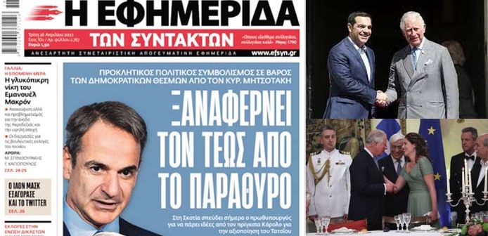 Έτσι το κύριο άρθρο της ΕφΣυν μας πληροφορεί ότι σε ένα μήνα συμπληρώνονται 5 χρόνια από τον θάνατο του Κωνσταντίνου Μητσοτάκη και ο γιός του Κυριάκος επιθυμώντας να τιμήσει «αναθέτει τώρα στον πρίγκιπα Κάρολο της Ουαλίας την “αξιοποίηση” του Τατοΐου» κάτι που δεν ισχύει δεδομένου ότι το πρώην ανάκτορο αξιοποιείται από το Υπουργείο Πολιτισμού. Και το κύριο άρθρο συνεχίζει: «Με την ανάθεση ιδιαίτερου ρόλου για το Τατόι στον Κάρολο ο πρωθυπουργός έρχεται σε ευθεία αντίθεση με την τελεσίδικη απόφαση της ελληνικής πολιτείας το 1994, αλλά και με την κήρυξή του ως διατηρητέου από το Κεντρικό Συμβούλιο Νεωτέρων Μνημείων.»