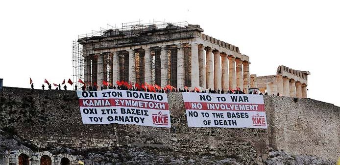 «Όχι στον πόλεμο, καμία συμμετοχή, όχι στις βάσεις του θανάτου», έγραφε το πανό που ανάρτησε σήμερα το πρωί το ΚΚΕ στον ιερό βράχο της Ακρόπολης.