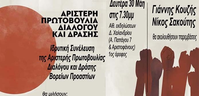 Η Αριστερή Πρωτοβουλία Διαλόγου και Δράσης Βορείων Προαστίων διοργανώνει στο Χαλάνδρι την Ιδρυτική της Συνέλευση τη Δευτέρα 30/5 στις 19.30, στην αίθουσα εκδηλώσεων του Δήμου στην οδό Παπάγου 7 (1ος όροφος).