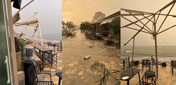 Σοκαριστικές οι εικόνες από την περιοχή δείχνουν τη δύναμη με την οποία το μπουρίνι «σφυροκόπησε» την περιοχή προκαλώντας ζημιές στον εξοπλισμό αρκετών καταστημάτων, ξεκολλώντας και παρασύροντας ακόμη και μεγάλες επαγγελματικές ομπρέλες σε παρακείμενο δρόμο ενώ το νερό φαίνεται να έχει εισβάλλει σε αρκετά από αυτά.