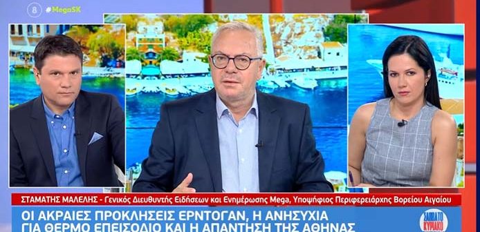 Για τις ελληνοτουρκικές προκλήσεις και την κατάσταση στα νησιά του βόρειου Αιγαίου τοποθετήθηκε στο πλατό του «MEGA Σαββατοκύριακο» με τον Ντίνο Σιωμόπουλο και την Στέλλα Γκαντώνα, ο γενικός Διευθυντής Ειδήσεων και Ενημέρωσης του Mega και υποψήφιος Περιφερειάρχης Βορείου Αιγαίου, Σταμάτης Μαλέλης.