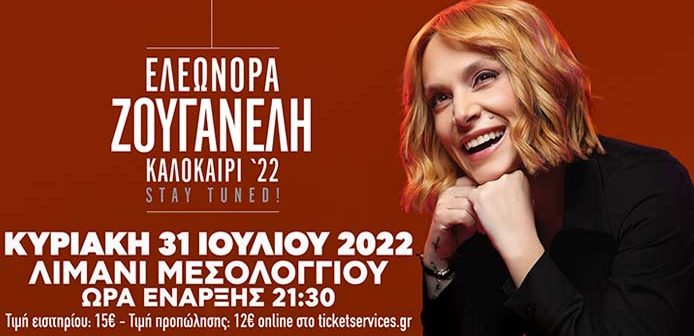 Η Ελεωνόρα Ζουγανέλη ανοίγει την αυλαία των μεγάλων συναυλιών στα πλαίσια των εκδηλώσεων «Πολιτιστικό Καλοκαίρι 2022» του Δήμου Ι.Π. Μεσολογγίου, η οποία έρχεται στο Μεσολόγγι με νέα μπάντα και τα νέα τραγούδια του Σταμάτη Κραουνάκη που πρόσφατα κυκλοφόρησαν στο album με τίτλο «ΤΙ ΝΑ ΛΕΜΕ ΤΩΡΑ» αλλά και με όσα έχουμε αγαπήσει μέχρι τώρα σε μια μοναδική συναυλία που θα λάβει χώρα στις 31 Ιουλίου στο Λιμάνι του Μεσολογγίου (έναντι του Αγίου Νεκταρίου) και ώρα 21:30΄μ.μ.