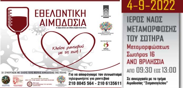 Η αιμοδοσία θα πραγματοποιηθεί στον Ι. Ν. Μεταμόρφωσης του Σωτήρος, από το τμήμα Αιμοδοσίας του Σισμανόγλειου Νοσοκομείου «Αμαλία Φλέμινγκ» , από τις 09:30 – 13:30, με τη συμβολή των Εθελοντών ιατρών και νοσηλευτικού προσωπικού των Δημοτικών Ιατρείων.