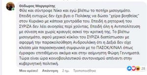 «Φίλε και σύντροφε Νίκο και εγώ βλέπω το ποτήρι μισογεμάτο. Επειδή ευτυχώς δεν έχει βγει ο Πολάκης να δώσει “χείρα βοηθείας” στον Κυριάκο με κάποια χοντράδα του. Επειδή η ρητορική του ΣΥΡΙΖΑ δεν λέει ανοησίες περί χούντας. Επειδή όλη η Αντιπολίτευση με σύνεση και χωρίς κραυγές ασκεί την κριτική της.