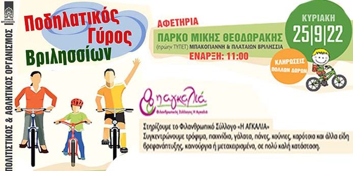 Ο Πολιτιστικός & Αθλητικός Οργανισμός Δήμου Βριλησσίων διοργανώνει Ποδηλατικό Γύρο την Κυριακή 25 Σεπτεμβρίου 2022 και ώρα 11:00,με αφετηρία και τερματισμό το Πάρκο ΜΙΚΗΣ ΘΕΟΔΩΡΑΚΗΣ (πρώην ΤΥΠΕΤ), Μπακογιάννη & Πλαταιών.