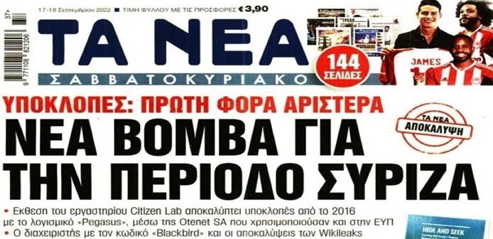 Συγκεκριμένα η παραπάνω εφημερίδα με πρωτοσέλιδο δημοσίευμα φέρει τον τίτλο «Νέα βόμβα για την περίοδο ΣΥΡΙΖΑ -Υποκλοπές: Πρώτη φορά Αριστερά» και, μεταξύ άλλων, παρουσιάζει έκθεση του εργαστηρίου CitizenLab σύμφωνα με την οποία αποκαλύπτονται υποκλοπές από το 2016 με το λογισμικό «Pegasus».