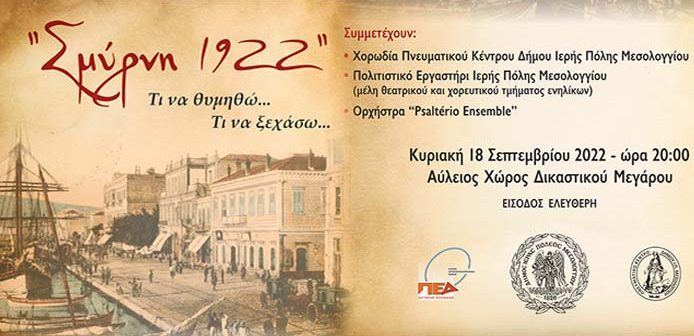 Ο Δήμος Μεσολογγίου θέλοντας να συμβάλει στη διατήρηση αυτής της μνήμης και να τιμήσει τους πρόσφυγες που εγκαταστάθηκαν στον τόπο μας , διοργανώνει εκδήλωση με τίτλο «Σμύρνη 1922 Τι να θυμηθώ… Τι να ξεχάσω…». Οι αναμνήσεις της Γιασεμής, μιας γυναίκας που αναγκάστηκε να εγκαταλείψει τη γενέθλια γη, θα μας ταξιδέψουν στη Σμύρνη του 1920 και μαζί μ΄ εκείνη θα ζήσουμε τις στιγμές της δόξας, του μεγαλείου αλλά και του αφανισμού της πατρίδας της.