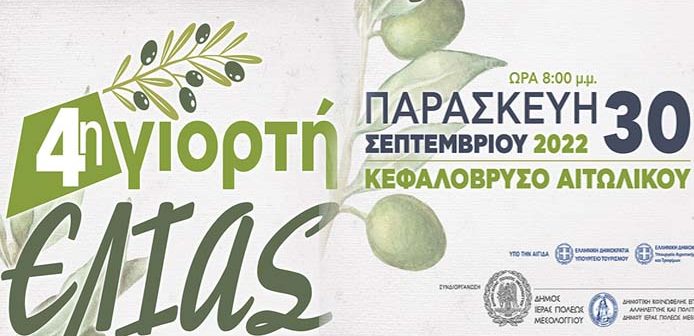 Για 4η συνεχή χρονιά, καλωσορίζουμε και γιορτάζουμε έτσι τη νέα σοδιά, με εδέσματα ελιάς, χορούς, τραγούδια και χαμόγελα, στη μεγάλη «Γιορτή Ελιάς» που θα λάβει χώρα τη Παρασκευή 30 Σεπτεμβρίου 2022 και ώρα 20:00 στο Κεφαλόβρυσο Αιτωλικού.