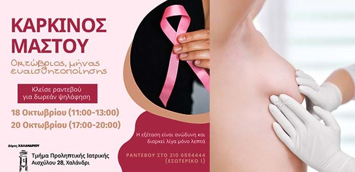 Τη δυνατότητα δωρεάν ψηλάφησης μαστών στο χώρο του τμήματος Προληπτικής Ιατρικής (Αισχύλου 28) προσφέρει στις γυναίκες της πόλης, ο Δήμος Χαλανδρίου συμμετέχοντας στις δράσεις ευαισθητοποίησης για τη σημασία της πρόληψης στην αντιμετώπιση του καρκίνου του μαστού, ενόψει της Παγκόσμιας Ημέρας Κατά του Καρκίνου του Μαστού, στις 25 Οκτωβρίου.
