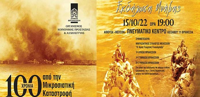 Με αφορμή τη συμπλήρωση 100 χρόνων από την Μικρασιατική καταστροφή, σας προσκαλούμε στην εκδήλωση που θα πραγματοποιηθεί στις 15 Οκτωβρίου 2022 , ημέρα Σάββατο κι ώρα 19:00 στην αίθουσα «Μουσών» του Πνευματικού κέντρου, οδός Κισσάβου 11.