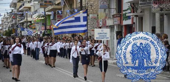 - Παρέλαση στην πλατεία Κέννεντυ, Αναπήρων και Θυμάτων Πολέμου, μαθητών, μαθητριών, Προσκόπων, Οδηγών και Τμήματος Ε.Ε.Σ (τμήματος Μεσολογγίου), Πυροσβεστικής, Αστυνομίας και του Στρατού.