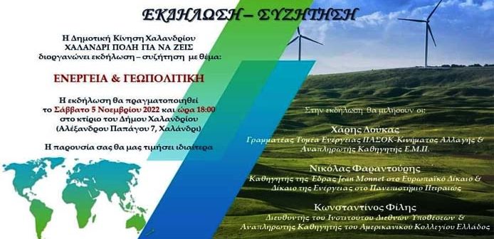 Η Δημοτική Κίνηση Χαλανδρίου «ΧΑΛΑΝΔΡΙ ΠΟΛΗ ΓΙΑ ΝΑ ΖΕΙΣ» με επικεφαλής το Γιώργο Θωμά, διοργανώνει μι απολύ ενδιαφέρουσα και επίκαιρη εκδήλωση – συζήτηση με θέμα: «ΕΝΕΡΓΕΙΑ & ΓΕΩΠΟΛΙΤΙΚΗ».