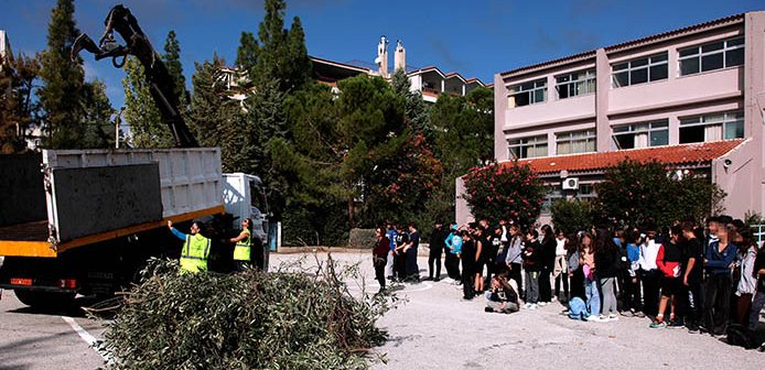 Πέντε στελέχη της υπηρεσίας Καθαριότητας, με επικεφαλής τον αντιδήμαρχο Διαχείρισης Απορριμμάτων Κώστα Γερολυμάτο -μαζί με ένα απορριμματοφόρο συλλογής του καφέ κάδου, μια αρπάγη, ένα μηχανικό σάρωθρο και ένα ηλεκτρικό όχημα αυτοψιών– βρέθηκαν στο προαύλιο του σχολείου και έδωσαν στα παιδιά τη δυνατότητα να δουν και να μάθουν από πρώτο χέρι όλη τη διαδικασία συλλογής των βιοαποβλήτων.