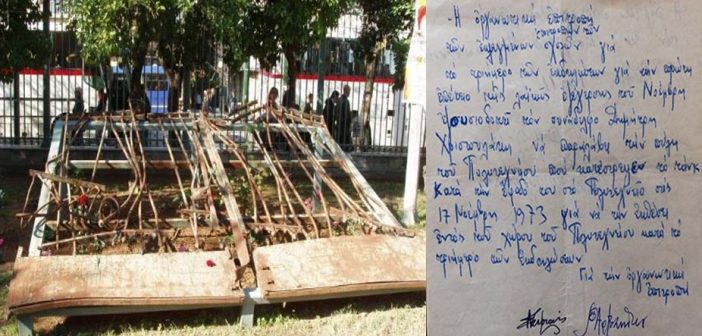 Τα λόγια ανήκουν στον αγωνιστή του Πολυτεχνείου Δημήτρη Χριστουλάκη, αντιδήμαρχο σήμερα Πολιτικής Προστασίας του Δήμου Χαλανδρίου, που όχι μόνο έζησε τα γεγονότα της εξέγερσης μέσα στο Πολυτεχνείο, αλλά ήταν και αυτός που μετέφερε, στην πρώτη επέτειο της εξέγερσης, τον Νοέμβριο του 1974, την τσακισμένη από το τανκ πύλη, που είχε παραπεταχτεί στην Πανεπιστημιούπολη του Ζωγράφου, εκεί που ανήκε, στο χώρο του Πολυτεχνείου.