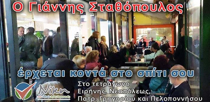 Ο Γιάννης Σταθόπουλος ως επικεφαλής της Δημοτικής Κίνησης «Νίκη των Πολιτών», έρχεται στη συγκεκριμένη γειτονιά για να φτιάξετε από κοινού το πρόγραμμα του Δήμου για την επόμενη πενταετία.