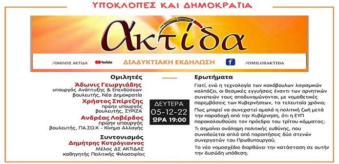 Ο Όμιλος Πολιτικής Σκέψης και Δράσης ΑΚΤΙΔΑ διοργανώνει την Δευτέρα 5 Δεκεμβρίου 2022, από ώρα 19.00, διαδικτυακή ( μέσω της πλατφόρμας Zoom ) εκδήλωση-συζήτηση, με θέμα: «Υποκλοπές και Δημοκρατία»